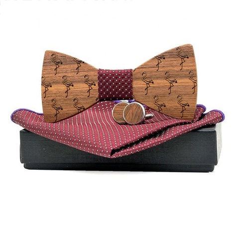 ชุดกระดุมข้อมือผ้าเช็ดหน้าและโบว์ผูกทำจากไม้รูปนกกระเรียนน่ารักสำหรับผู้ใหญ่